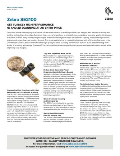 Empower your most cost-sensitive and space-constrained designs with affordable high quality barcode scanning with the SE2100. This entry-level tiny turnkey combination imager and illumination system delivers the high-performance scanning your business-class users require, with the margins your business needs.
