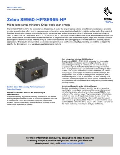 The SE960-HP combines top-tier performance, range, flexibility, reliability, and durability in one of the smallest engines available. Its patented Adaptive Scanning technology automatically switches between wide and narrow scan angles, enabling users to capture barcodes from near contact to distances of up to 15 ft/4.5 m—the widest range in its class.